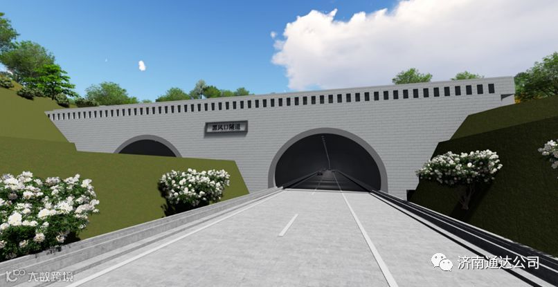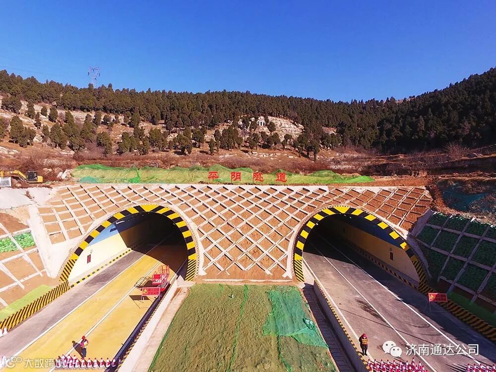 新建段内的平阴隧道是济南市国省道干线公路的第一条隧道。平阴隧道长度440米,两幅隧道间净距约13米,双向四车道,一级公路标准,洞顶最大埋深约71米。隧道进口端采用端墙式洞门,出口端采用削竹式洞门。平阴隧道建设有三大特点:一是把平阴的特色--玫瑰元素融合进隧道洞口的装饰建设中;二是洞内墙壁采用顶部蓝色下部黄色的双色设计,达到了清新、明快、安全的效果;三是在隧道施工中开发应用了先进的BIM技术,实现了对工程质量、安全、进度的智能化管理。