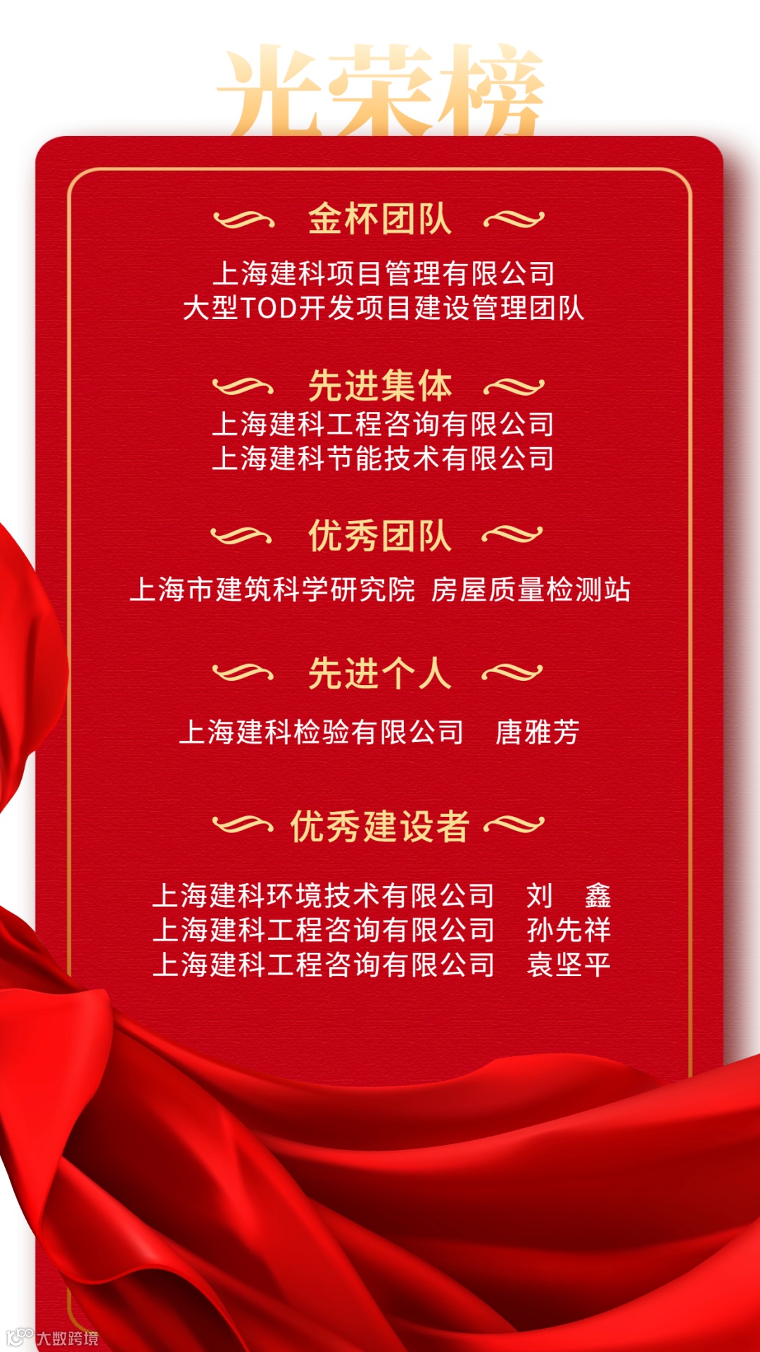 2月1日,2023 年度上海市重点工程实事立功竞赛表彰大会在上海展览中心召开。上海建科荣获2023年度上海市重点工程实事立功竞赛金杯团队、先进集体等多项荣誉,其中:上海建科项目管理有限公司大型TOD开发项目建设管理团队荣获“金杯团队”荣誉称号,2家单位荣获“先进集体”荣誉称号;1人荣获“先进个人”表彰;1个团队荣获“优秀团队”表扬;3人荣获“优秀建设者”表扬。
