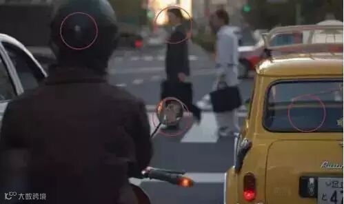 此图中的元素较多,近景中的人物,人物车上后照镜中的影像,右边黄色的车, 以及远处过街的行人,都是比较突显的视觉点,元素较多便容易产生主题的分歧。