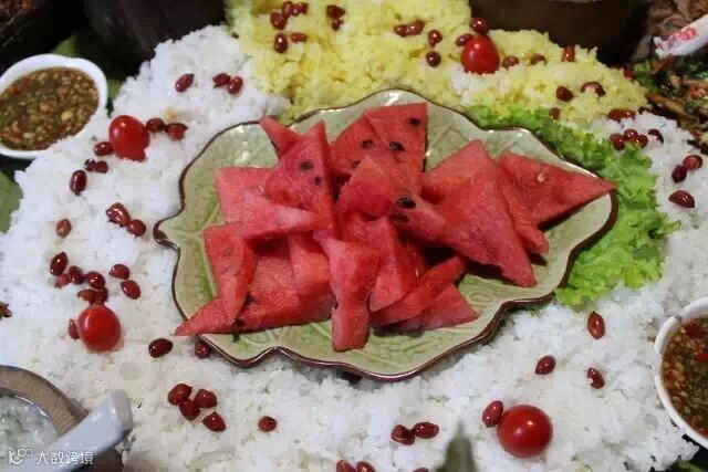 看着是不是很酸爽,从读本君的现场体验来讲,这样的菜肴是十足的原生态呢。比如说盛器,用一大簸箕替代了盘子,用芭蕉叶替代了碗,用双手替代了筷子。从形式上来说,有点原始人吃饭的赶脚,而从味觉上来说,更接近食材本真的美味。