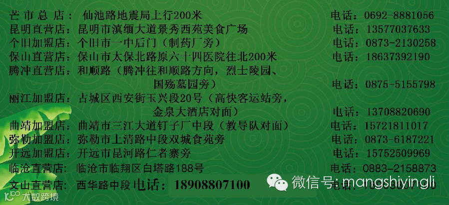 纯正的德宏美食,景颇手抓饭、绿叶宴,纯天然绿色环保无公害饮食,所有原材料(包括大米)、厨师均来自德宏。欢迎各界人士前来品尝并给予建议,因纯属功夫菜请提前预定!详细订餐电话见下图!(关注微信公众号mangshiyingli并分享朋友圈可到以下各店领取精美小礼品一份)