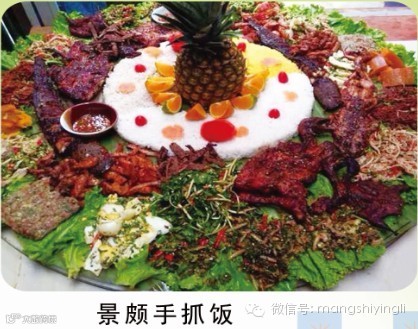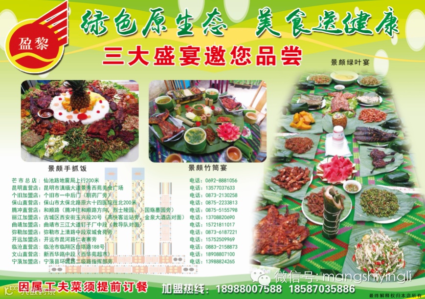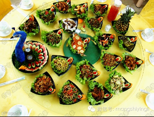 盈黎民族风情园已将原生态的景颇绿色美食绿叶宴、手抓饭、以及栩栩如生的孔雀宴推广至全省各地州