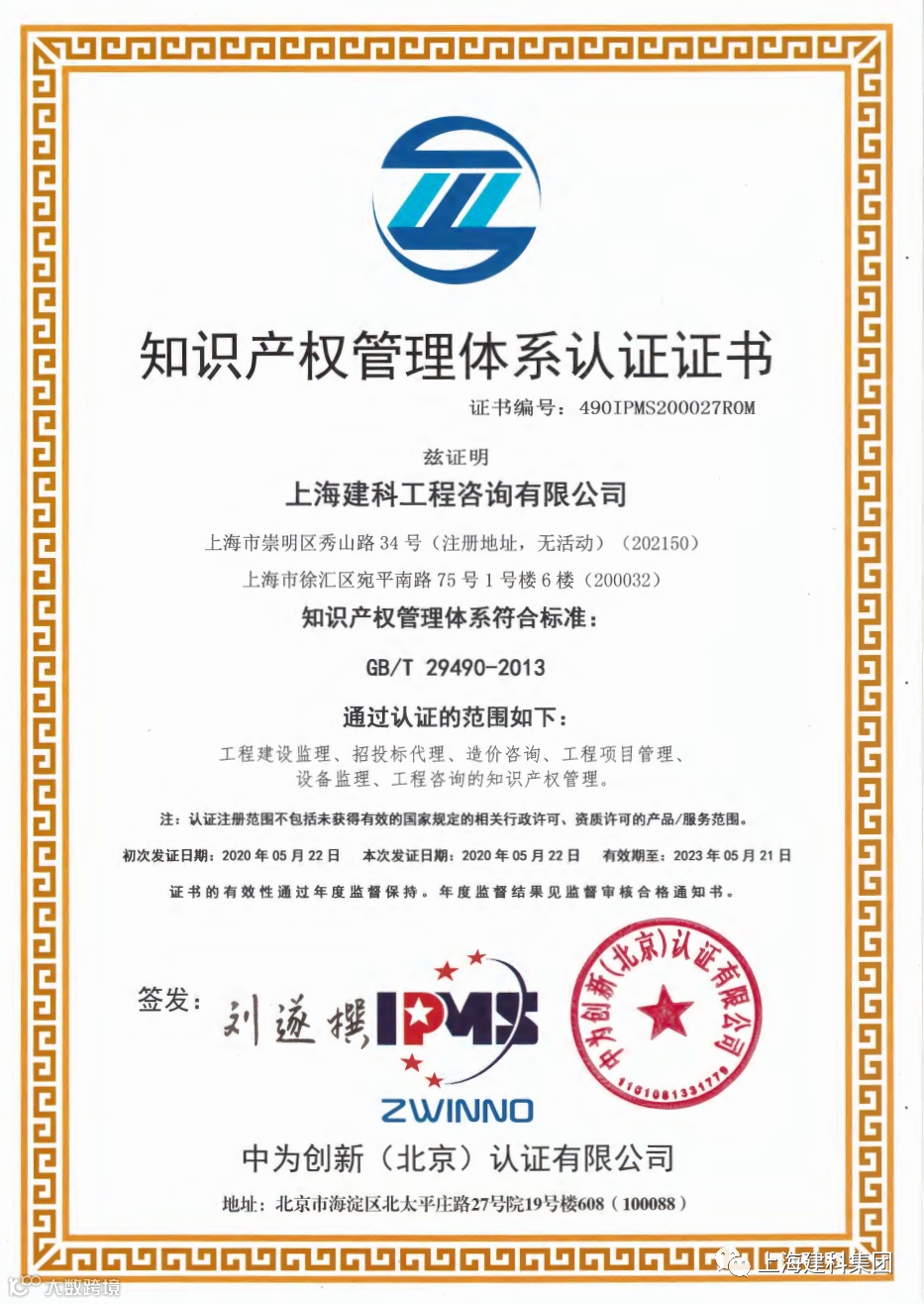 近日,上海建科工程咨询有限公司成功取得知识产权管理体系认证证书,标志着公司知识产权进入规范化、系统化、科学化管理的全新阶段。该证书的获得将更好地保障技术创新,推动公司可持续发展。