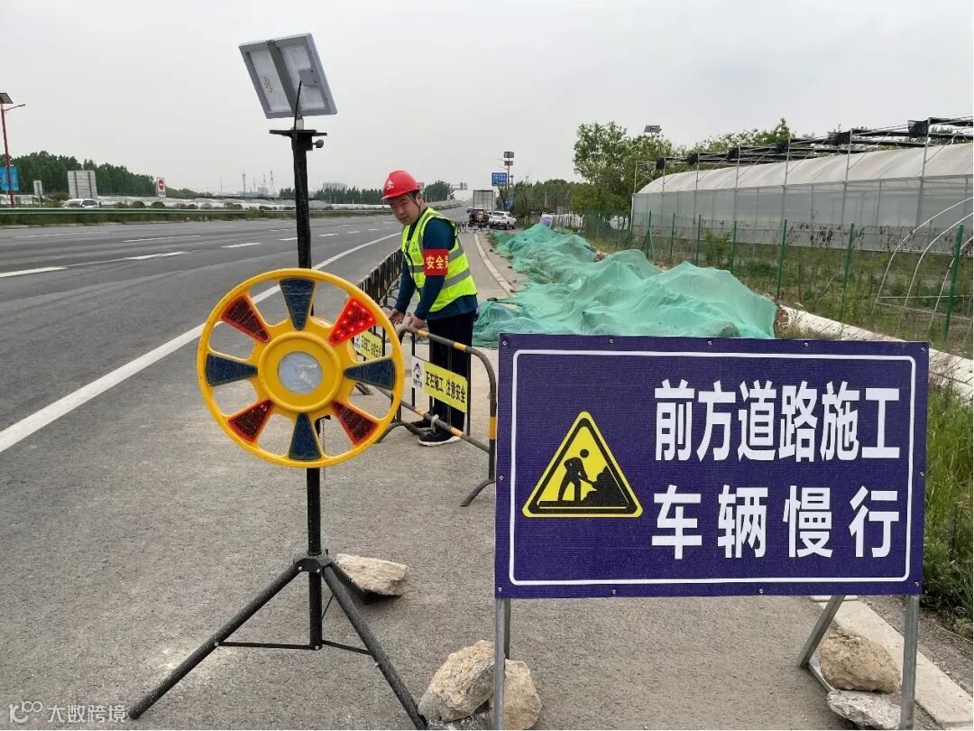拍摄内容:济南市历城区凤凰北路东客站立交改造工程。因该工程位于高速路下桥口,车辆众多,车速过快,遂在此处安装围挡,放置爆闪灯及公示牌。