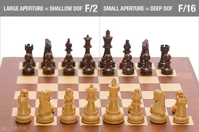 左:光圈F2(大)景深小,只有对焦点平面上的图像(图中为第一排棋子)清晰
