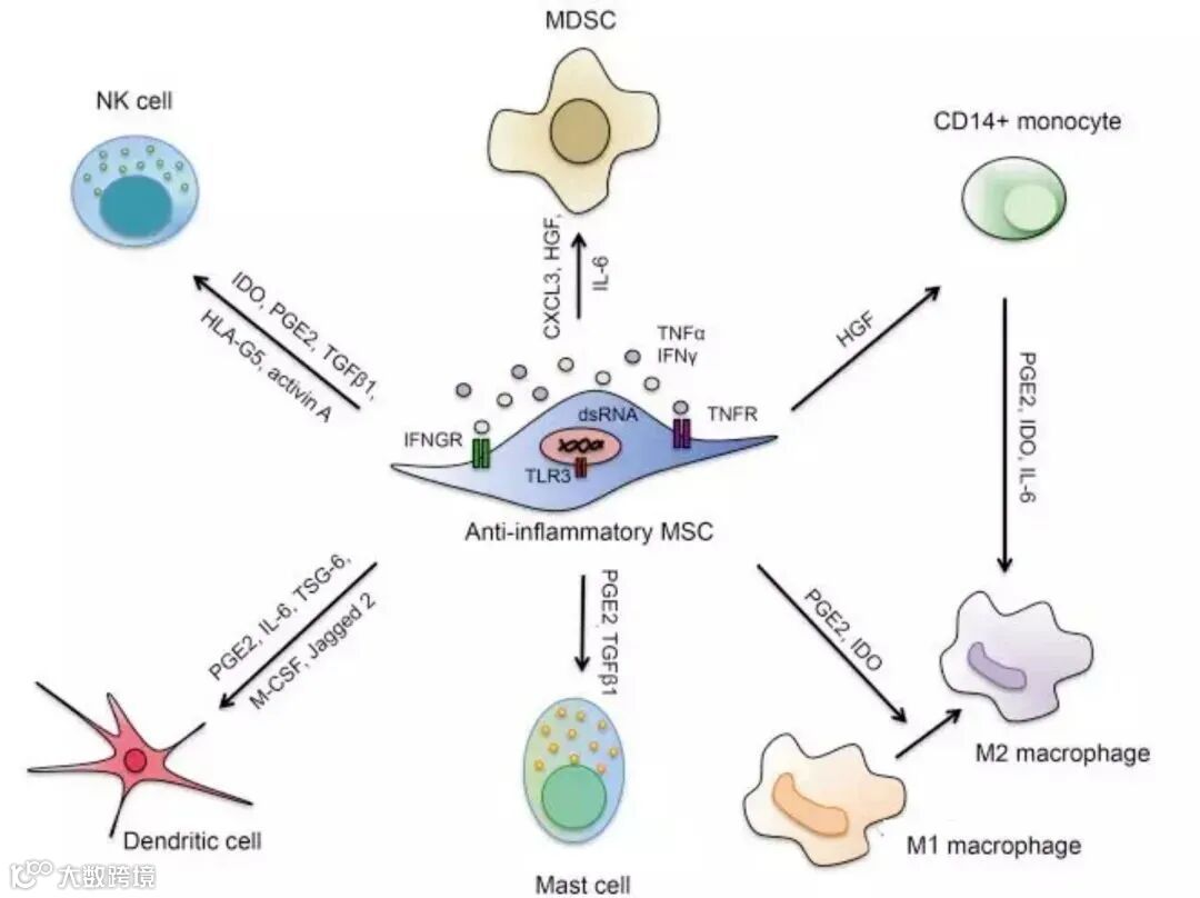 说回免疫调节功能本身,大量研究表明,MSC到达炎症现场后,可以调节多种免疫细胞,如巨噬细胞、嗜中性粒细胞、肥大细胞、树突细胞和自然杀伤性细胞等