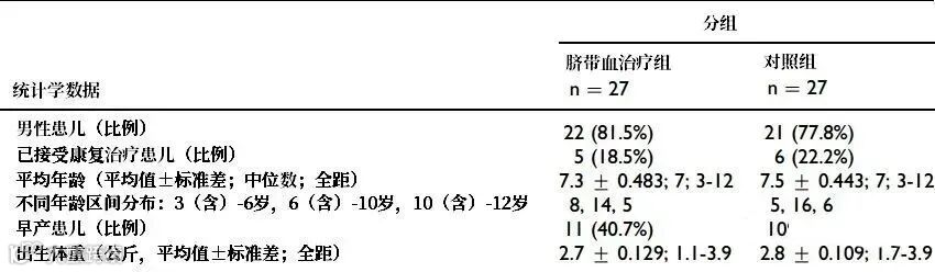 这项临床研究入组了54名患儿,平均分为两组。治疗组的27人在大约一个月内接受了4次脐带血间充质干细胞输注(单次细胞量为5x10^7,每次间隔7天),而对照组的27人输注的是0.9%生理盐水。两组受试者均同时接受基础康复治疗。