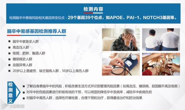 核子基因推出脑卒中易感基因型检测项目,高危人群通过做基因检测可以早期预知是否携带脑卒中易感基因,对脑卒中的危险因素进行积极有效的干预,根据基因进行针对性的防控和治疗,可以明显地降低脑卒中发病率,减轻卒中疾病负担。