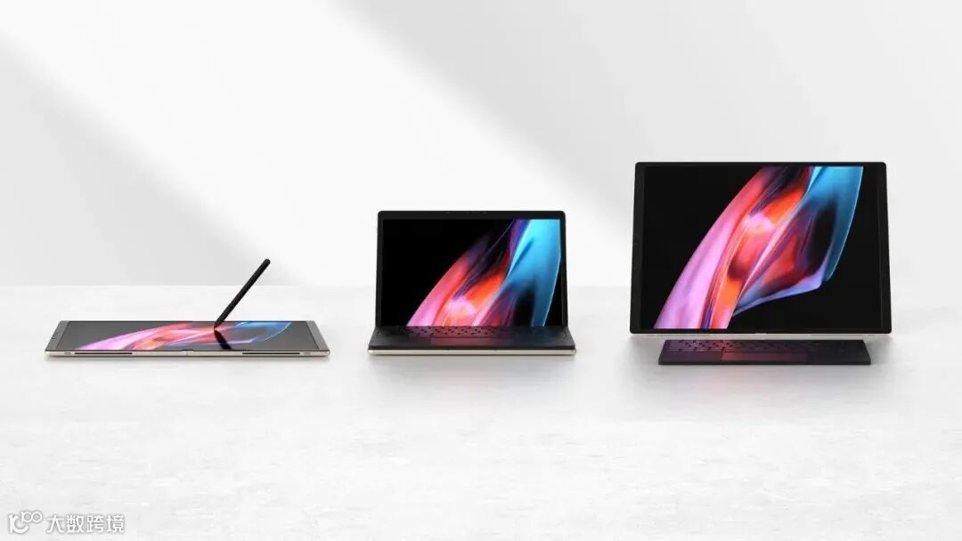 键盘可以安装在折叠处,也可以覆盖折叠处下方一半的屏幕,以获得双屏笔记本电脑体验。如果需要更多工作空间,它可以放置在 17 英寸宽屏桌面上,并通过无线键盘使用。