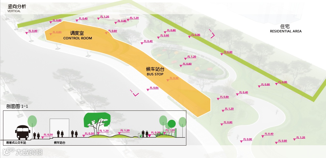 设计方案以公交驿站为中心,融入休憩、充电、贩卖、城市服务等功能,同时将整个场地做动静体验划分,满足不同需求。等候区紧邻公交车道,服务功能藏在背后,两个区域的标高不同,一个经由台阶连接人行道,一个平接公园,沿着台阶向上,准确地裁切出公交站台的一角。