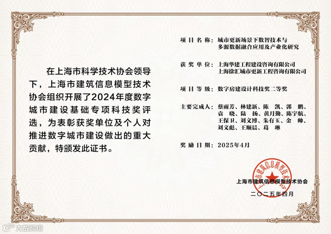 建设咨询联合上海徐汇城市更新工程咨询有限公司申报的《城市更新场景下数智技术与多源数据融合应用及产业化研究》项目斩获二等奖。