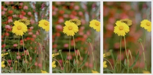 在构图的基本方法中,运用景深虚化处理背景是非常常见的。利用长焦距或大光圈或缩短拍摄距离,都可以营造出浅景深的效果。浅景深可以将复杂的背景虚化,进而凸显主体。右上图是应用最基础的方法进行拍摄的示意图,离相机最近的花朵代表前景,往后依次是中景和背景。右下图是经过虚化处理突出景深效果的拍摄方法,前景和背景都被虚化了,从而突出中景的被摄主体。