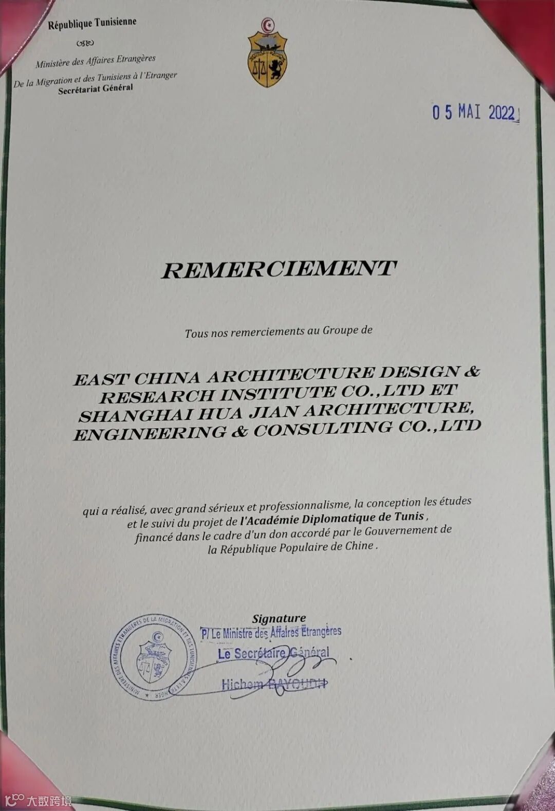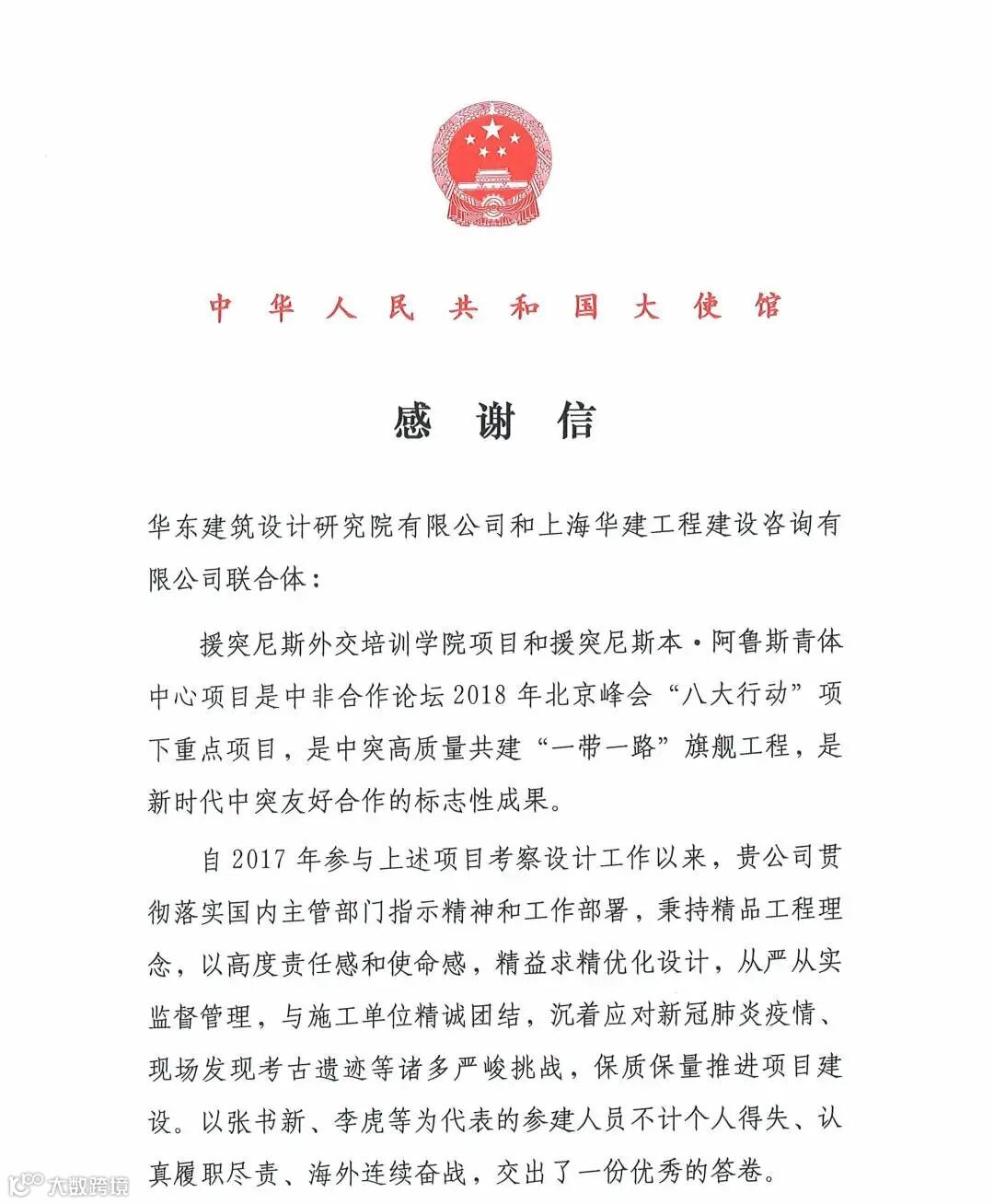 2022年8月12日,中华人民共和国驻突尼斯大使馆向上海华建工程建设咨询有限公司发来感谢信,对公司圆满完成援突尼斯外交培训学院及援突尼斯本·阿鲁斯青体中心两大工程表示诚挚的感谢!信中对公司自2017年项目考察以来,始终贯彻落实国内主管部门指示精神和工作部署,秉承精品工程理念,以高度责任心和使命感,精益求精的工作作风予以充分的肯定;对项目团队认真履行职责,沉着应对疫情,海外连续奋战的工作精神表示赞扬;对不计得失、认真履责的海外员工进行了表扬,并对关心支持项目建设的公司相关领导表达了感谢。