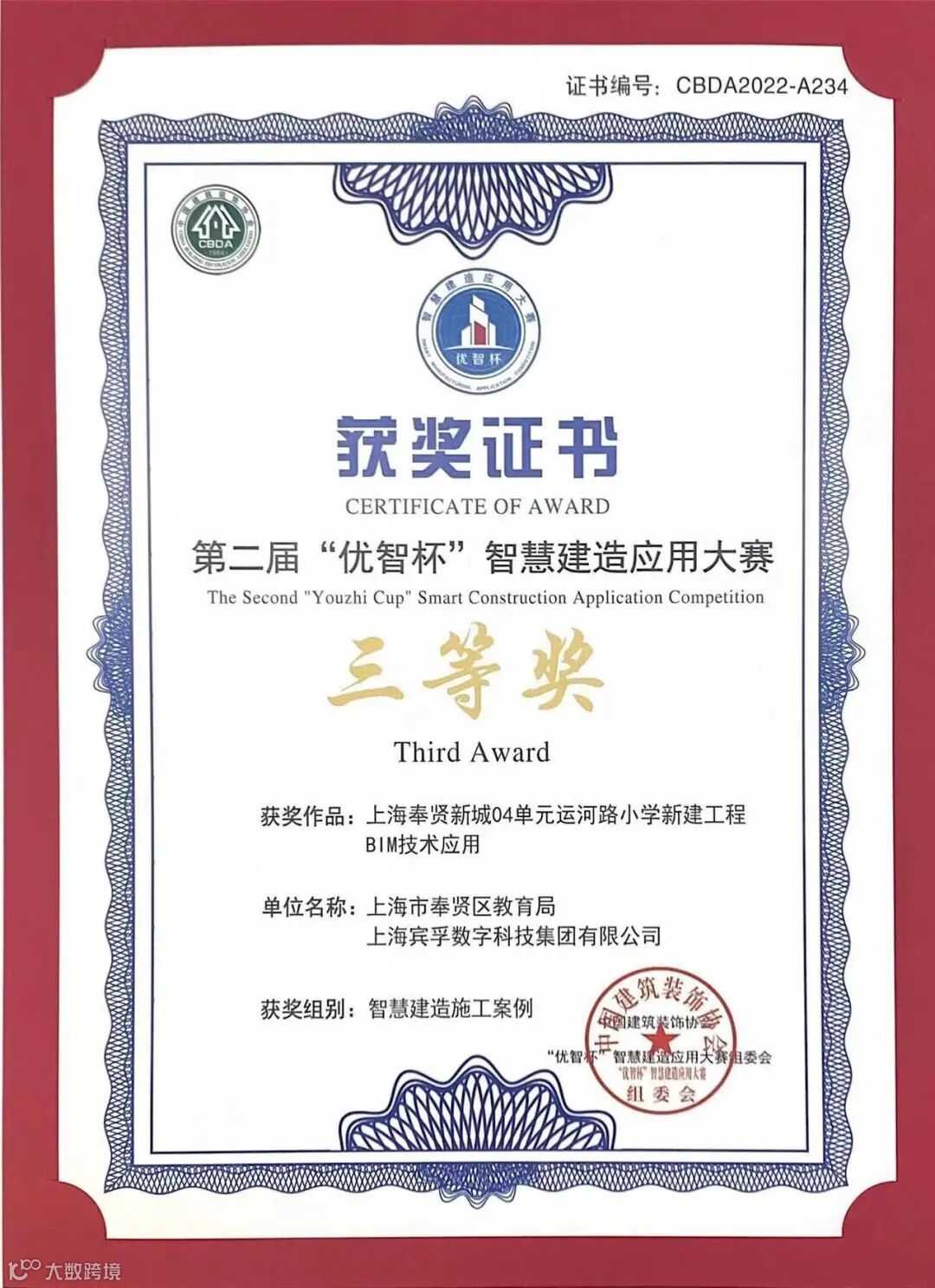 近期,中国建筑装饰协会举办了第二届“优智杯”智慧建造应用大赛。公司及BIM单位联合申报的上海奉贤世界外国语项目和奉贤新城04单元运河路小学(暂定名)新建工程项目荣获智慧建造施工案例三等奖。