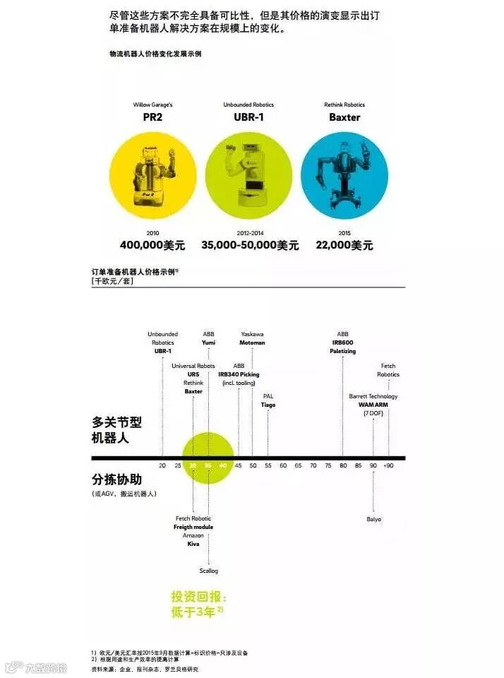 随着研究机构和初创企业(如Rethink、Fetch等)先后开发出低成本机器人解决方案,预计至2020年,大量机器人解决方案成本将降至10万欧元以下。相较大型的工业机器人企业(如ABB、Kuka等),这些高度灵活的初创企业更有可能颠覆市场。1990-2005年,工业机器人的价格降低了一半;2010-2015年期间价格再次折半。2015年,最便宜的机器人解决方案(Unbounded Robotics UBR-1)约为2万欧元。同时,大型机器人企业也相应地提出了完整的低成本方案,价格在4万-5万美元之间(ABB Yumi-ABB IRB14000)。