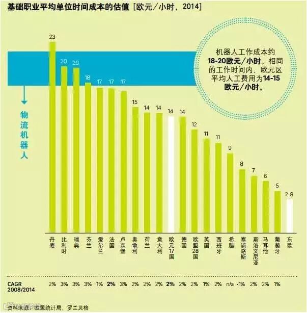 投资机器人化解决方案的成本优势已经显现,在大多数西欧国家,一套机器人目前价值10万-11万欧元。考虑到成熟市场中的机器人能提升20%-30%的生产率,这种程度的投资3年便能收回成本。机器人正常工作平均花费为18-20欧元/小时,而欧元区人工操作的平均花费是14-15欧元/小时(法国为17-18欧元/小时,比利时达20欧元/小时)。当然,只按时间单位成本计算并非最为准确,因为综合成本还会根据安装机器人的多少而变化,但是我们依然能够据此做出比较和判断。上述计算也不包括延长机器人的“工作”时间,但其结果足以凸显机器人化日趋提升的重要性。