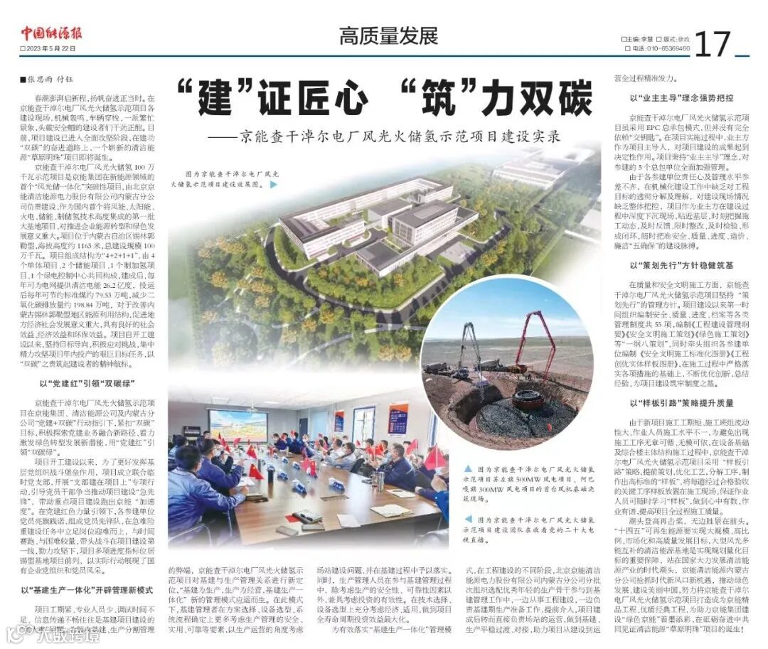 公司在《中国能源报》发表稿件《夺取首季“开门红”冲刺全年“满堂彩”》《“建”证匠心,“筑”力双碳——京能查干淖尔电厂风光火储氢示范项目建设实录》《当“数字化”为“绿色”装入智慧“芯”——智慧运维撬动新能源生产力》,在能源媒体宣传企业发展成果,壮大企业对外宣传影响力,不断提升企业文化软实力。 |