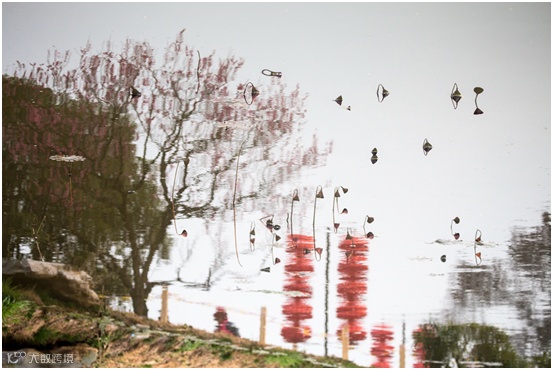 冬天已经过去,立春的红灯笼也已挂上,岸边的桃花正在盛开,池塘中的荷花只剩下干枯的莲蓬浮在水面,也只有这是真实的出现在照片中,虚实的对比更吸引观者进行思考。