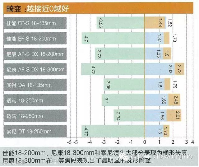 000在畸变测试中,广角端总是会出现明显的桶形畸变,而在中长焦范围时会转换为枕形畸变。