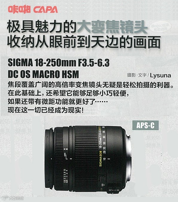 ----这是镜头成功“瘦身”的经典范例,新的微距版适马18-250mm比其他前身在物理长度上缩减了12mm,重量减少了160g,而且用62mm的滤镜口径代替了之前的72mm。更值得一提的是,尽管它比适马自己上一代的老的18-200mm镜头多出了50mm的变焦范围,但在重量上却更为轻巧。这要归功于其TSC(热稳定复合)的新型材料。适马声称这种材料不仅在重量上更轻,而且比常见的聚碳酸酯材质的镜头更能对抗极端的温度变化。