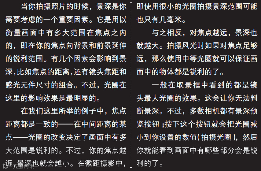 ● 光圈是曝光指数中的一个重要组成部分,它决定了相机感光元件上接收的进光量。用大光圈拍照意味着感光元件可以接收到更多的光,相反,小光圈则会减少进光量。从原理上说,它和人的瞳孔的功能是一样的。在黑暗的环境中,你的瞳孔会扩张,这样能够让更多的光进入眼睛中,而在明亮的环境中瞳孔则会缩小。对于摄影来说,如果进入的光越多,则曝光所需的时间越短,这样你就能够进行瞬间的抓拍,提高你拍出锐利的照片的几率。