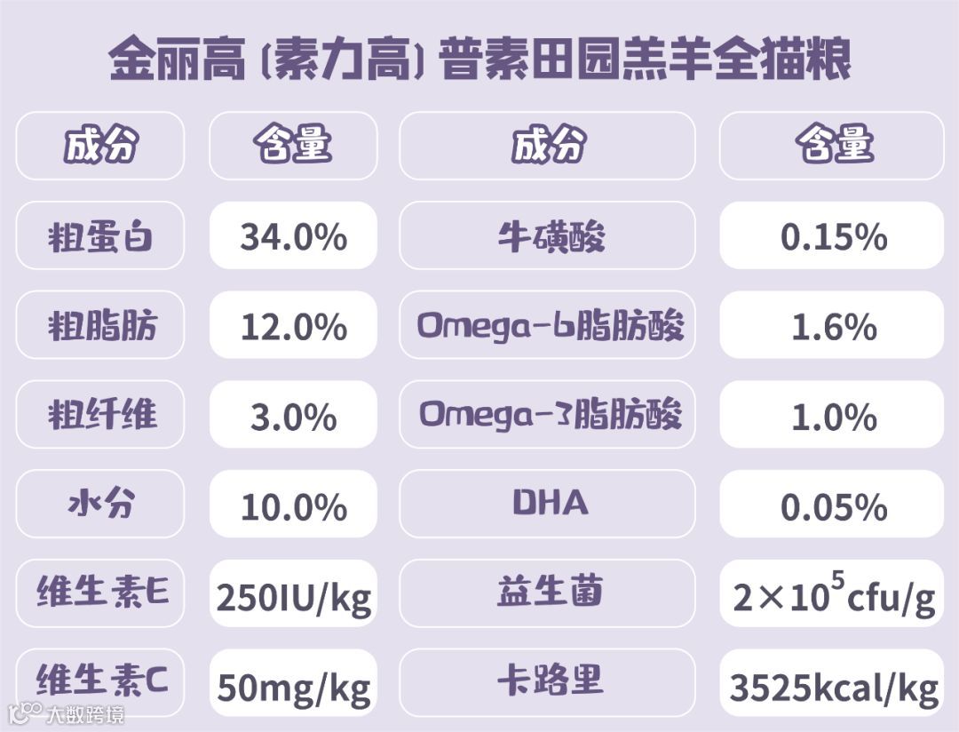 蛋白质含量较高,达到34.0%,牛磺酸含量0.15%,均符合全阶段猫咪的需求。