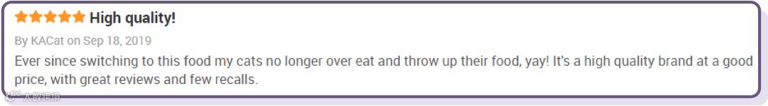 “自从换成这种食物以来,猫咪再也不会吃得太多呕吐食物了,耶!它是一个优质的品牌,价格很好,评论很好,召回很少。”