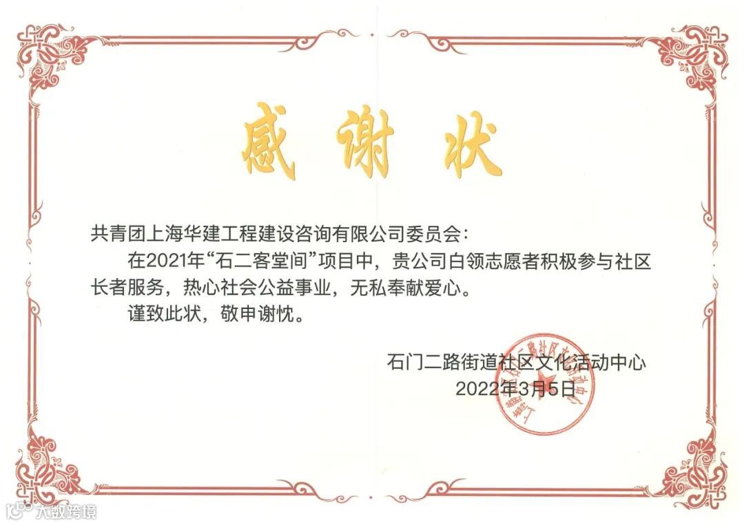 8月11日,公司团委与石门二路街道社区文化活动中心开展2022年度社企共建活动。作为一项长期性的项目,建设咨询团委多年来定期为街道提供各类志愿服务,积极履行社会责任,先后参与了“手机门诊”、暑托班、石二课堂间等多项志愿活动。在此次共建中,社区文化活动中心为表示对公司青年志愿者在2021年度“石二课堂间”公益项目中的无私奉献的感谢,为与会代表送上了感谢状,并签署了2022年度的志愿服务工作共建协议。