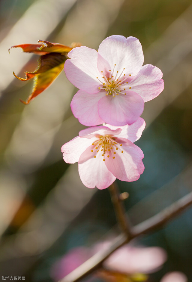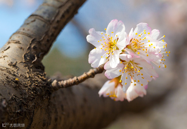 从东南沿海一路向北,来到华东和华中地区,装点这里春天的是另外几种颜色更为素雅的樱属植物。最早开花的是名符其实的迎春樱桃(C. discoidea),小花极为纤弱,白色的花瓣末端染着浅浅一抹粉红,清新尤甚。与之相似的华中樱桃(C. conradinae)也是花朵小巧玲珑的种类,花色从纯白到桃红都有,与迎春樱桃最显著的区别是前者花瓣二裂先端急尖、萼筒短,后者花瓣先端圆钝,萼筒瘦长。另一种尾叶樱桃(C. dielsiana)与二者亦近似,尾叶樱桃的萼片强烈反折包裹萼筒,据此可以将它们区别开。