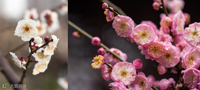 江梅型直脚梅(左,接近原种)与宫粉型直脚梅品种(右边)。