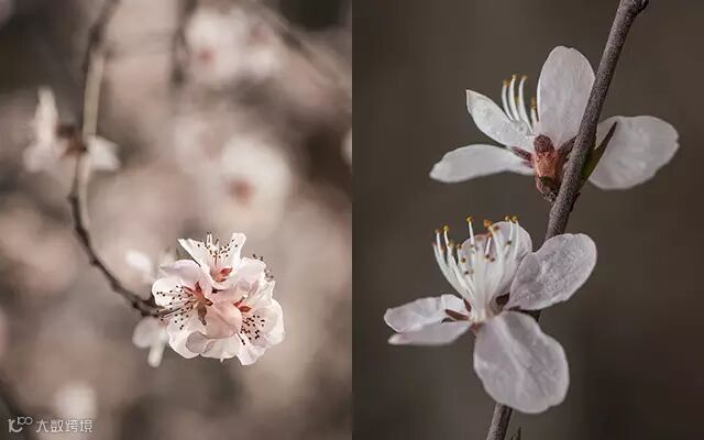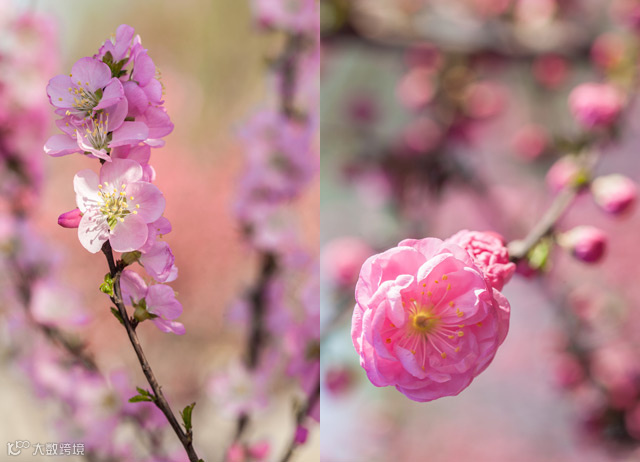 单瓣的(左)与重瓣的(右)榆叶梅。
