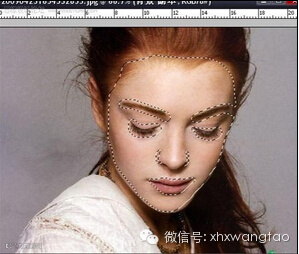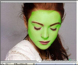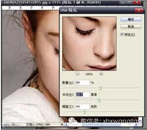 7.关键部分,在底层上用快速蒙版选区,选择皮肤部分,用滤镜/USM锐化,加强皮肤毛孔影象(图八)。