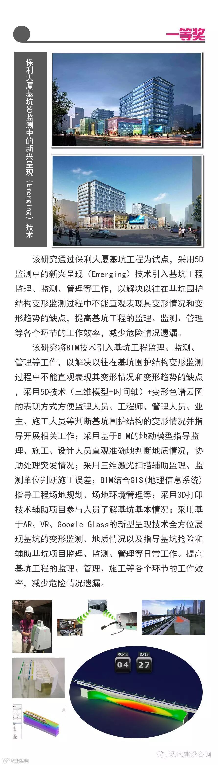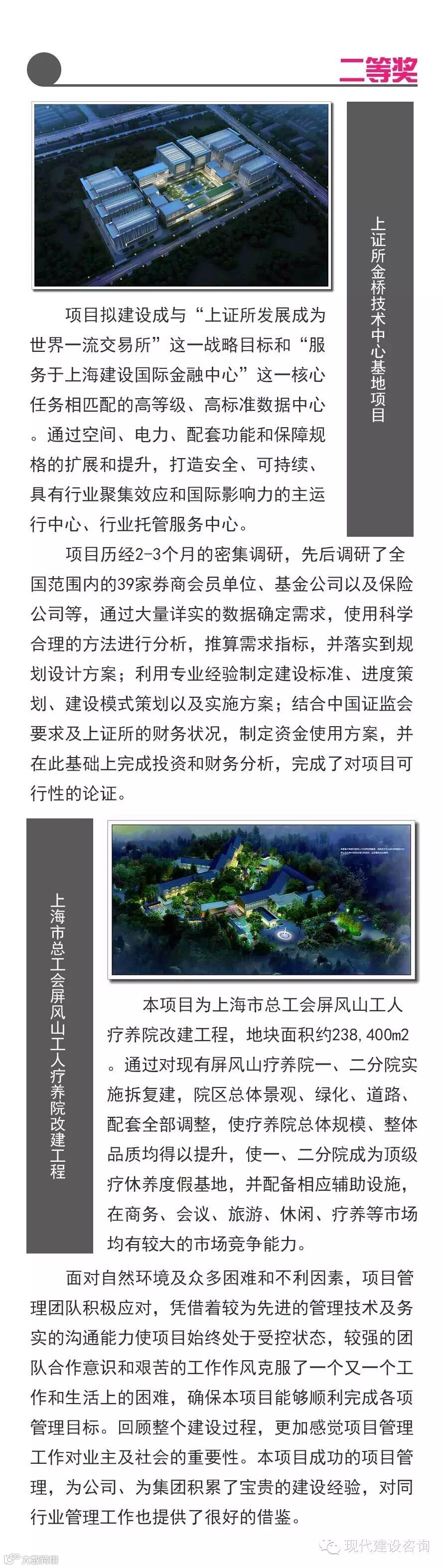 近期,上海市工程咨询行业协会开展了2015年度上海市优秀工程咨询成果评选活动。公司“保利大厦基坑5D检测中的新兴呈现”项目荣获优秀工程咨询成果一等奖;“上证所金桥技术中心基地”项目和“上海市总工会屏风山工人疗养院改建工程”项目荣获优秀工程咨询成果二等奖。