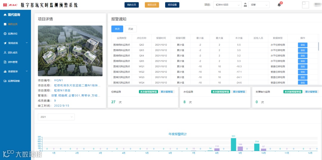 2、基坑监测平台——通过云端实时采集基坑数据,三维可视化方式直观展示基坑模型及监测数据,自动分析数据是否达到危险值,并通过APP及微信小程序向用户自动报警。