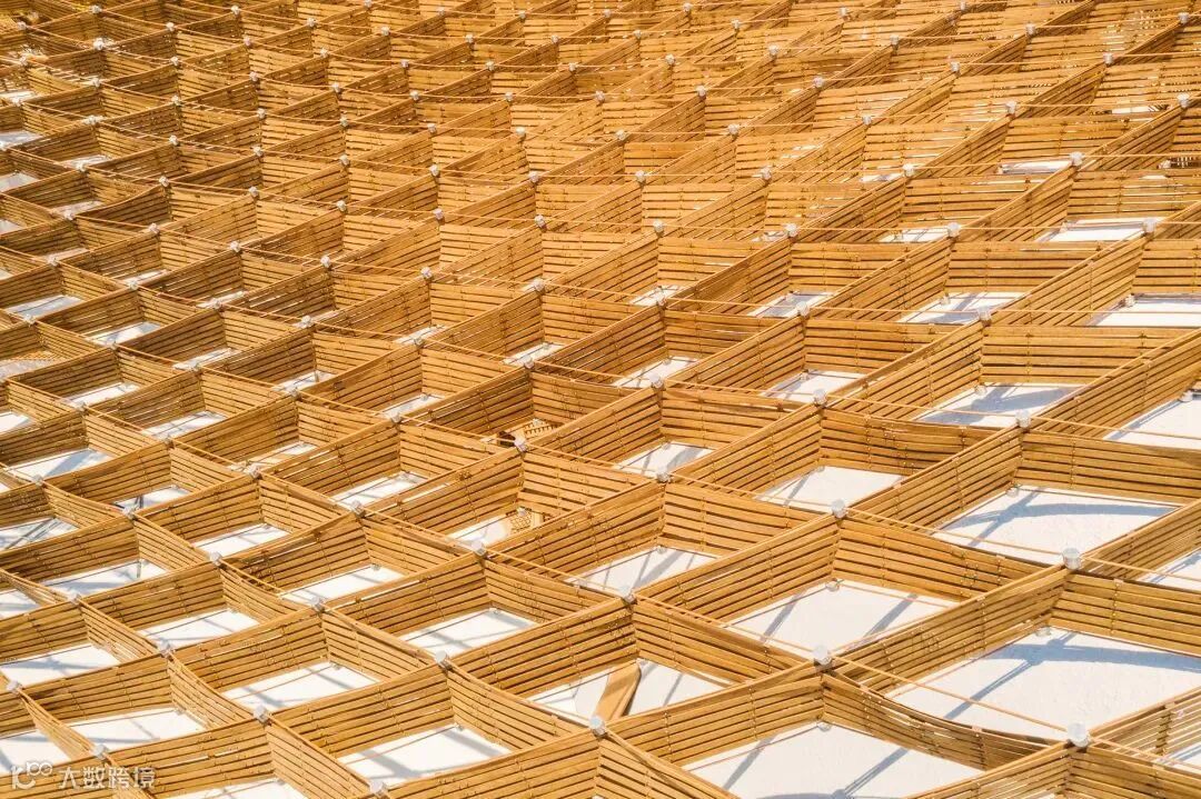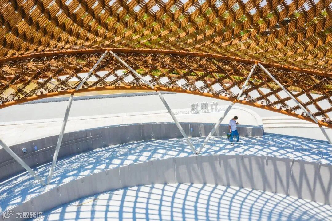 △部分运用3D打印技术建造的竹藤馆以“茧”为原型,独立的编织结构表皮采用高强度竹基纤维复合材料——竹钢,全手工制作,百天编织超万米。