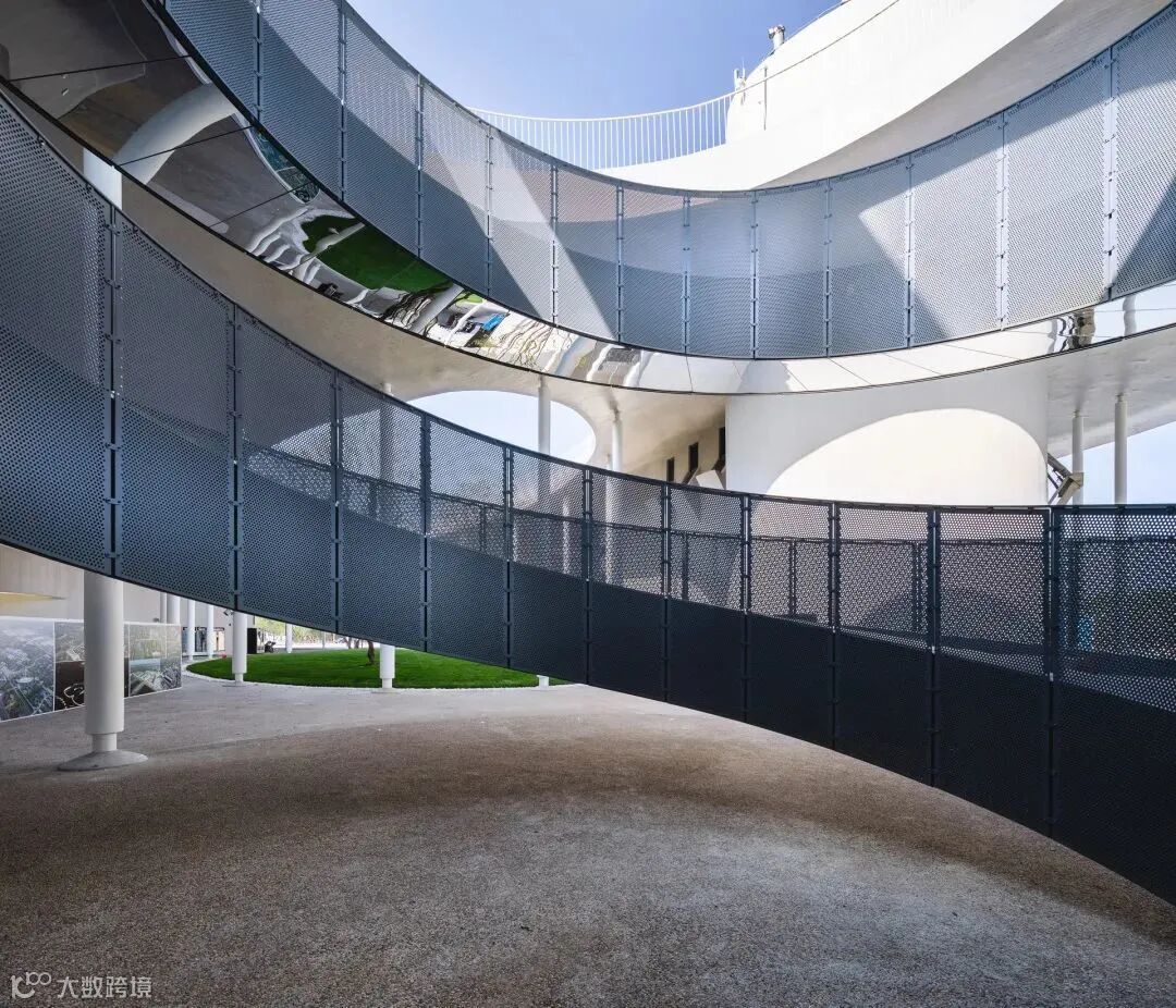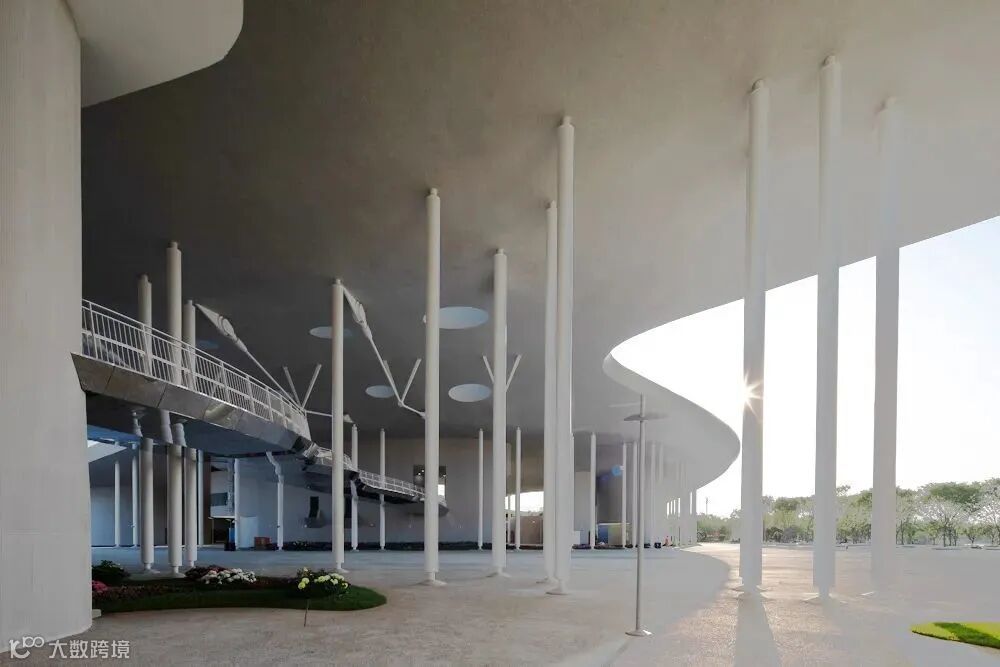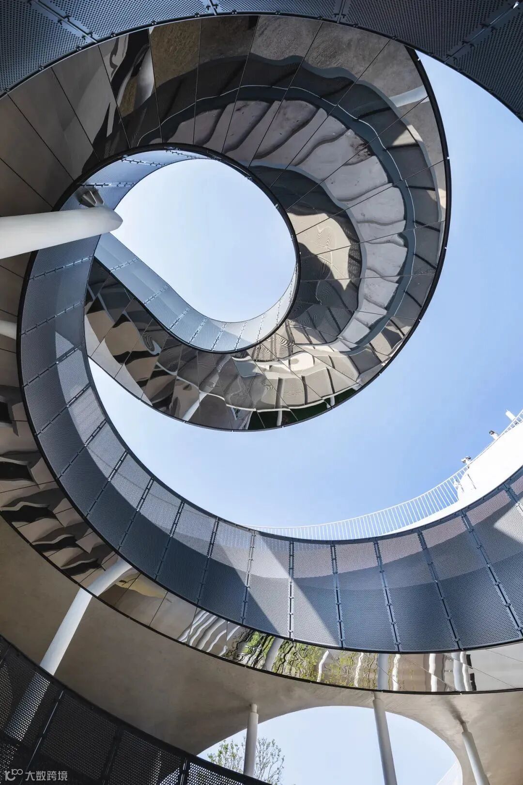 △世纪馆的"蝴蝶”由随机排列的高细摇摆柱支撑,形成“树林”意向。在"蝴蝶"的右翼,设计了一个螺旋上升的旋转楼梯,可直达屋顶。