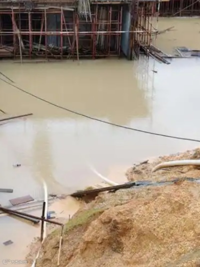 基坑靠近河流、湖泊、水库、渠道、水塘等水体时,因为暴雨导致水位暴涨、风暴潮、闸门失效或基坑围堰/挡水结构(如围堰、止水帷幕)失效,导致地表水直接涌入基坑。