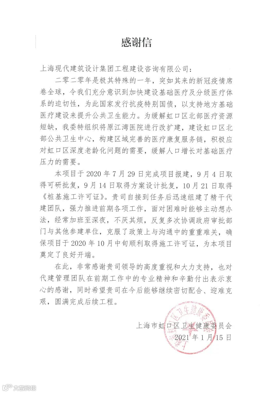 近日,公司收到了来自虹口区公共卫生中心项目业主的感谢信,来信对公司该项目管理团队在项目建设过程中的优异表现予以了肯定,并对未来的合作充满了期待。