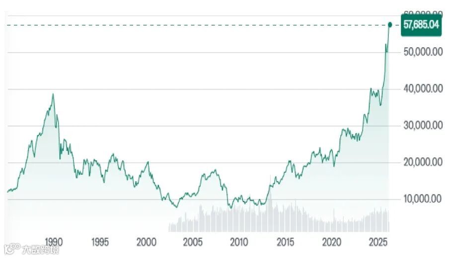 日本自民党在2月8日的众议院选举中,获得压倒性胜利,这是二次大战后,日本首次出现单一政党获得众议院三分之二的超级多数,这次选举结果,让日本未来几年的政治不确定性显著下降,也让高市早苗获得空前的政治授权,可以顺利推动她主张的宽松货币和财政政策。日股也应声大涨,日经225指数在2月9日(周一)一度大涨5.7%,且连续数日走扬,12日盘中更一度冲破58,000点整数大关,改写历史新高纪录(图一)。
