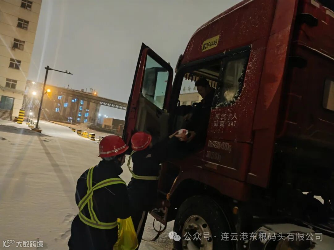 装车楼待装区排队等待装车。由于此时正在下着大雪,理保员上前询问后得知,由于暂未联系到开票的货代,他们没有汽车运输小票,暂时无法装车。得知此情况后,该理保员立即将情况汇报给了带班班长。为让司机们能在在寒冷的风雪夜感受到东粮的暖心