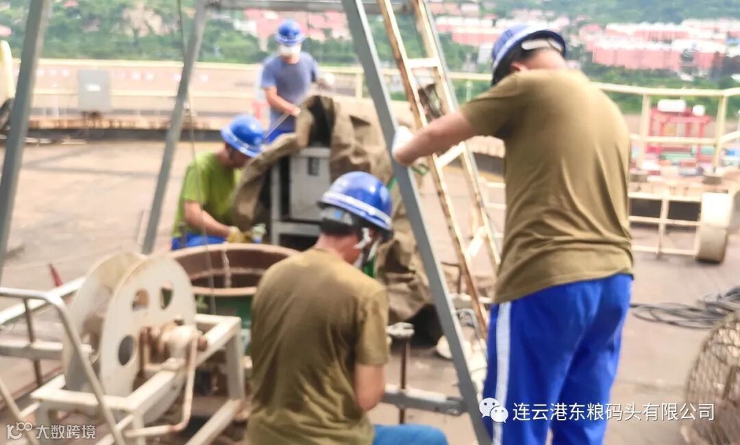 连云港东粮码头有限公司固机队清扫班班长龚建本带领着工人师傅们,在筒仓有限空间清仓作业中,下到仓里,爬到仓顶,攀爬在筒仓廊道上,接受高温的“烤”验,为保障生产顺利卸船,保障货物