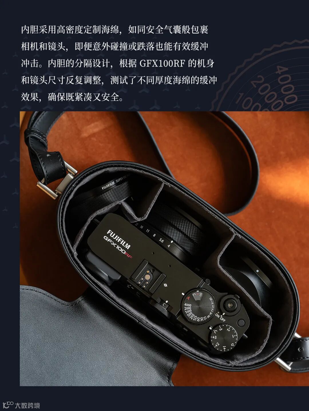 内衬采用定制防刮绒布,还有防潮层,为相机机身和镜头提供周全保护。五金件特别选用哑光质感配件, 与GFX100RF的专业气质完美呼应,更经过防锈抗氧化处理,确保长期使用的可靠性。