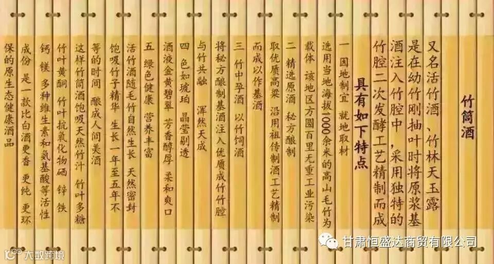 1、竹筒酒是一款全世界独一无二的酒,将改写人类酒文化的历史,被称为继白酒,红酒,啤酒,葡萄酒,洋酒,等之后的第六次酒业革命,它是唯一一款会呼吸的生态竹酒。