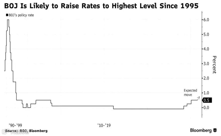 图一、日本央行12月有望把基准利率调升至0.75%,料将是自1995年以来最高的利率水平。