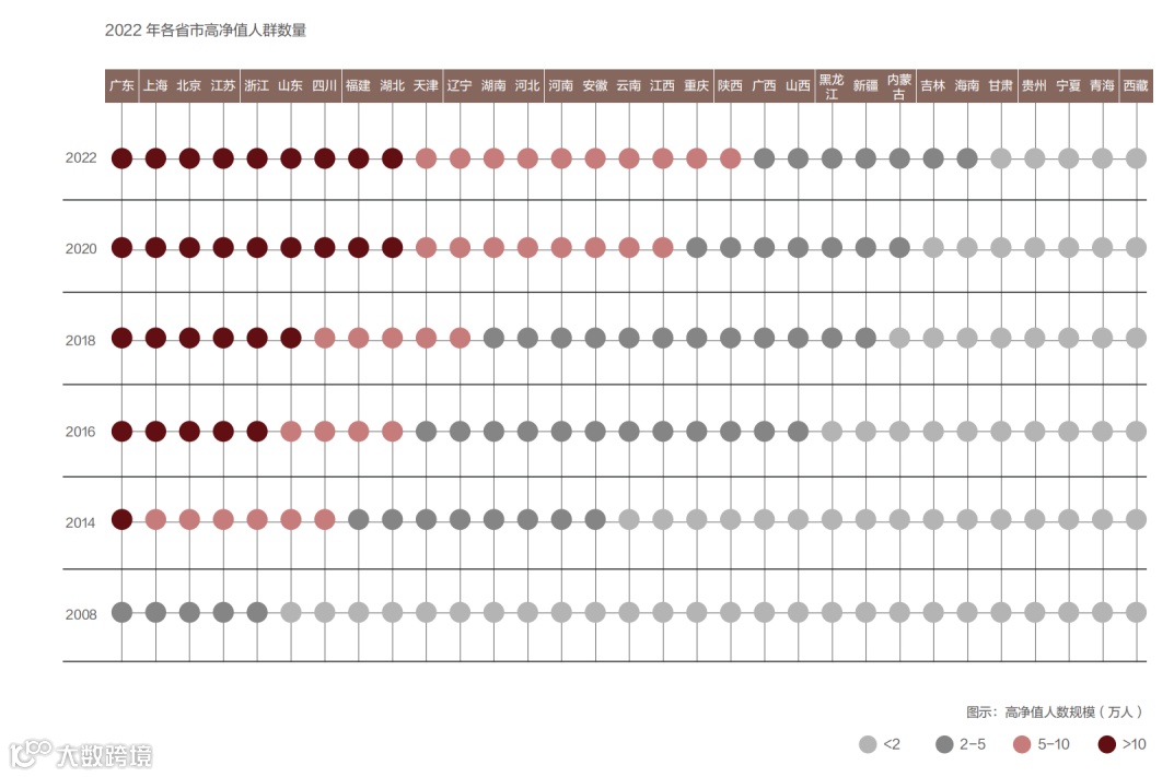 根据《2023中国私人财富报告》,截至2022年底,可投资资产在1,000万人民币以上的中国高净值人群数量达316万人,共持有可投资资产101万亿人民币。其中,全国有26个省市的高净值人数超过2万,包括首次超过2万的吉林和海南省,重庆和陕西高净值人数首次突破5万,广东、上海、北京等九个省市高净值人数维持在10万以上,十个省市的高净值人数超过5万人。分区域看,京津冀、长三角和珠三角三大经济圈的高净值人群保持增长,西部地区的高净值人数提升明显。
