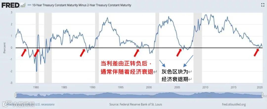 例如,最近一次的利差反转现象出现在2019年8月27日,当时利差由正转为-0.04%,然后在不到半年后的2020年2月,股市就出现暴跌,而美国和全球经济迈入衰退。