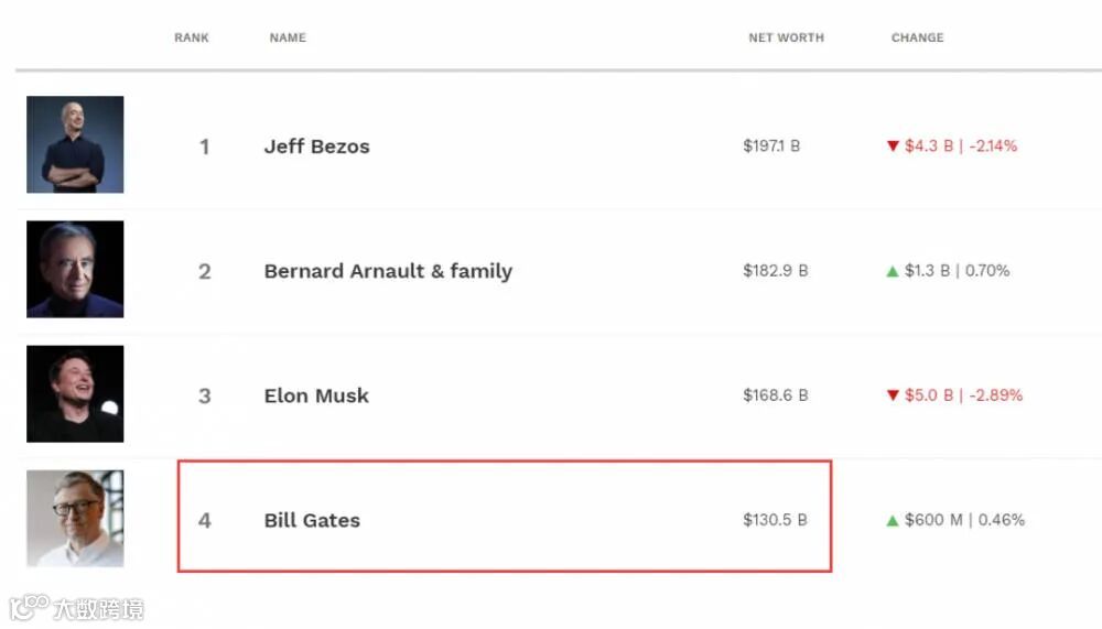 根据福布斯实时富豪榜,截至当地时间5月3日,比尔·盖茨身价达1,305亿美元,排名全球第四。
