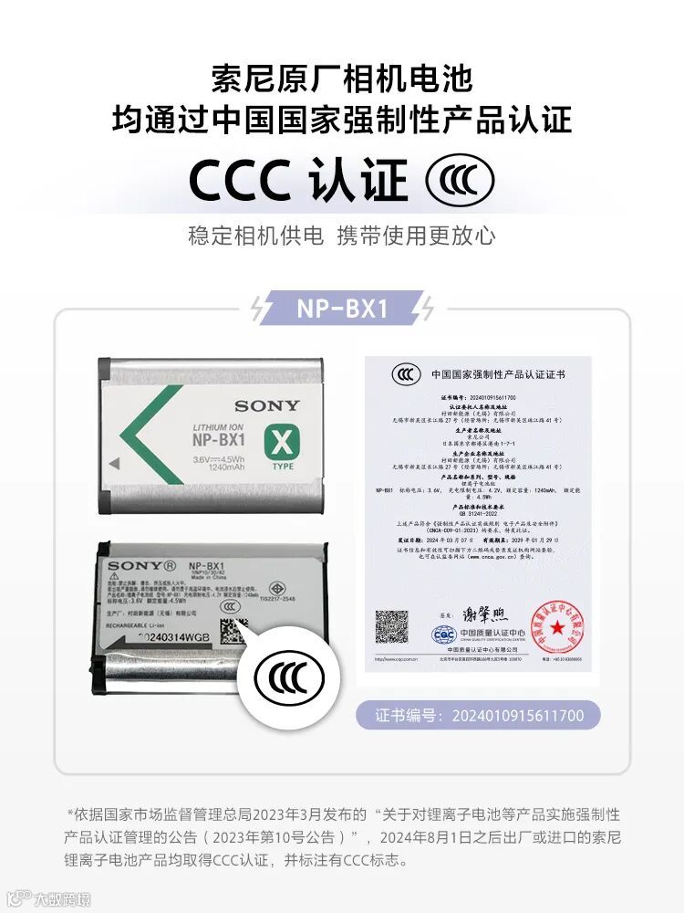 🔵依据国家市场监督管理总局2023年3月发布的“关于对锂离子电池等产品实施强制性产品认证管理的公告(2023年第10号公告)”,2024年8月1日之后出厂或进口的锂离子电池产品均须取得3C认证,并标注有3C标志。索尼相关产品均已按上述要求已取得3C认证,并符合国家相关法律法规及标准。