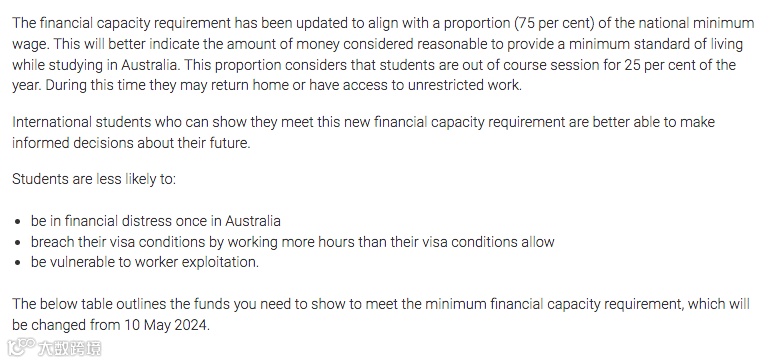 这次的调整的目的是为了国际学生在澳洲学习期间能够有足够的资金支持,以维持最低生活水平,是与澳洲最低工资的75%取齐。