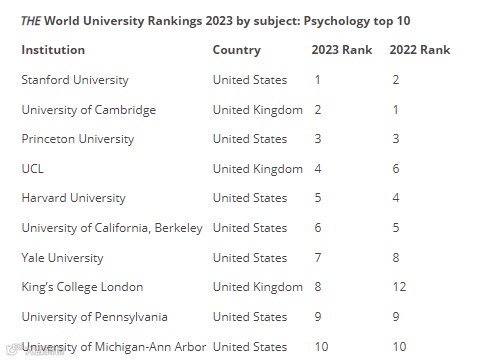 心理学领域,全球榜单前10的院校如下: